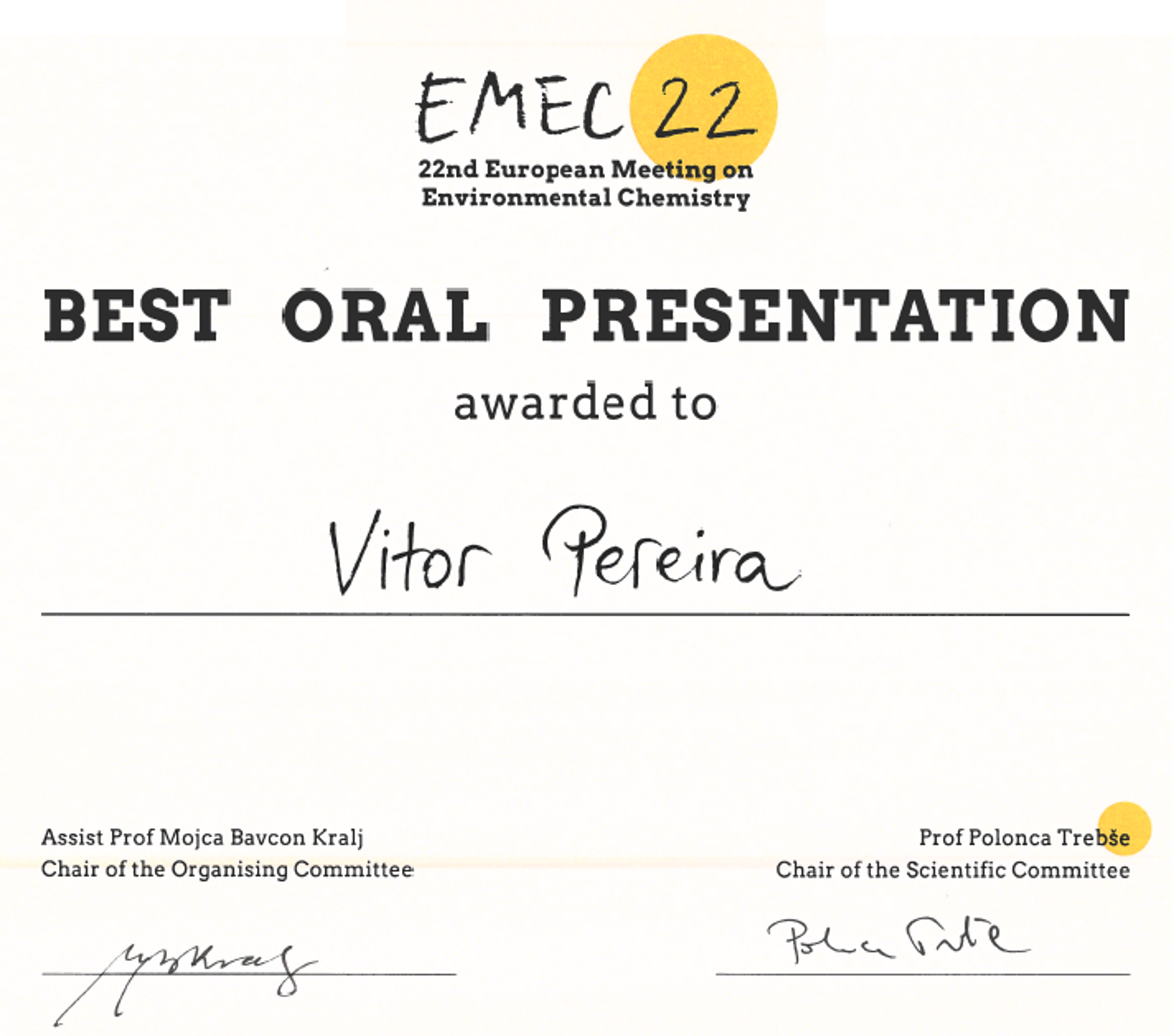 The 22nd European Meeting on Environmental Chemistry was hosted in Ljubljana, Serbia, from December 5th to 8th. Among the participants, Vitor Pereira had the opportunity to present his research on the development of novel methane decomposition reactors, with the presentation "New reactor approach for low-temperature catalytic methane decomposition", for which he was awarded the "Best Oral Presentation" prize.